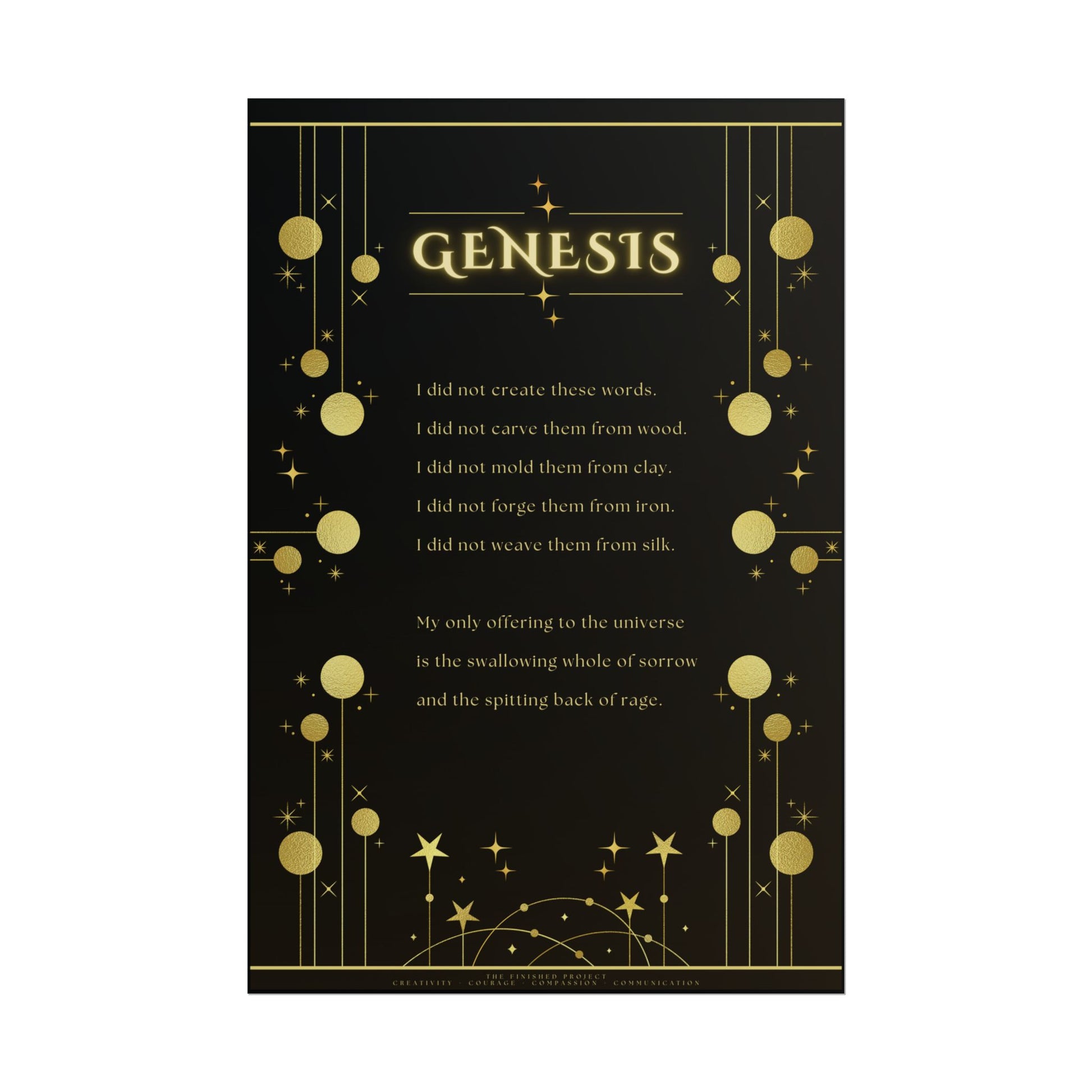 Make an offering to the universe with the "Genesis" poetry + art poster from The Finished Project. This unframed poetry print is made with museum-grade, heavyweight art paper and comes in two sizes to fit your living space.