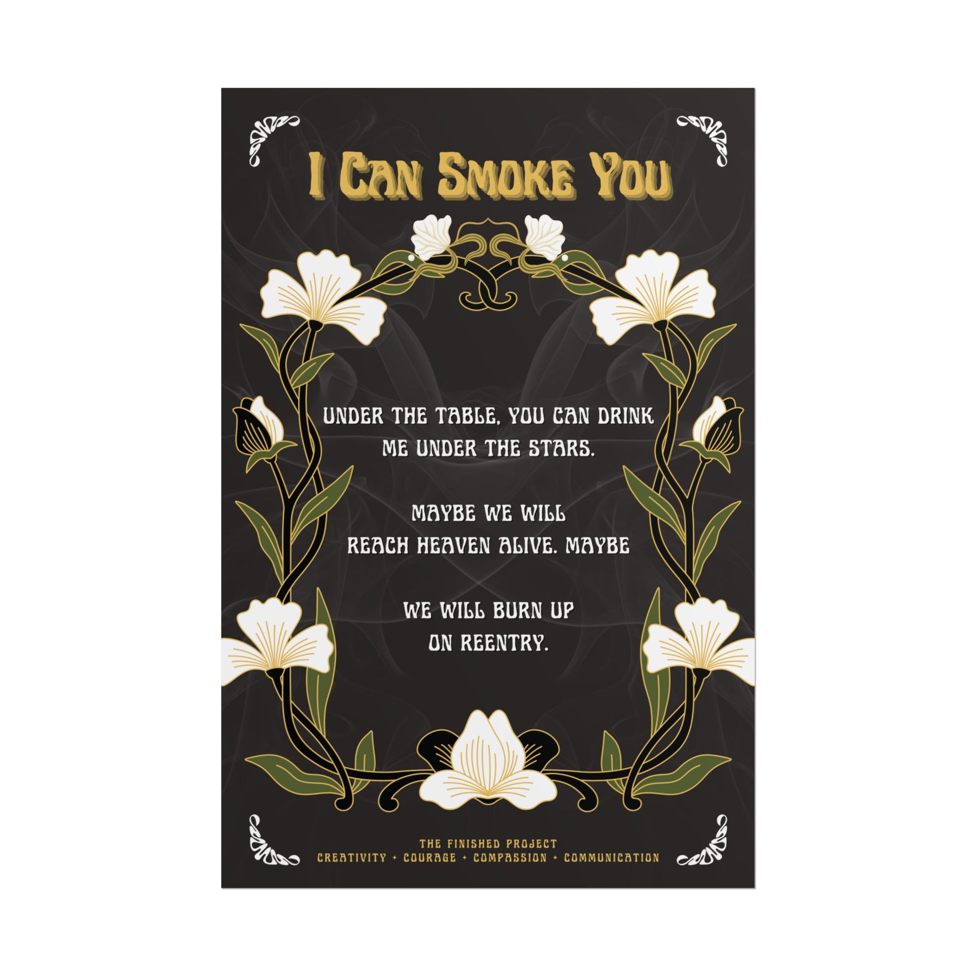 Set love on fire with the "I Can Smoke You" poetry poster from The Finished Project. This unframed poetry print is made with museum-grade, heavyweight art paper, and comes in two sizes to fit your living space.