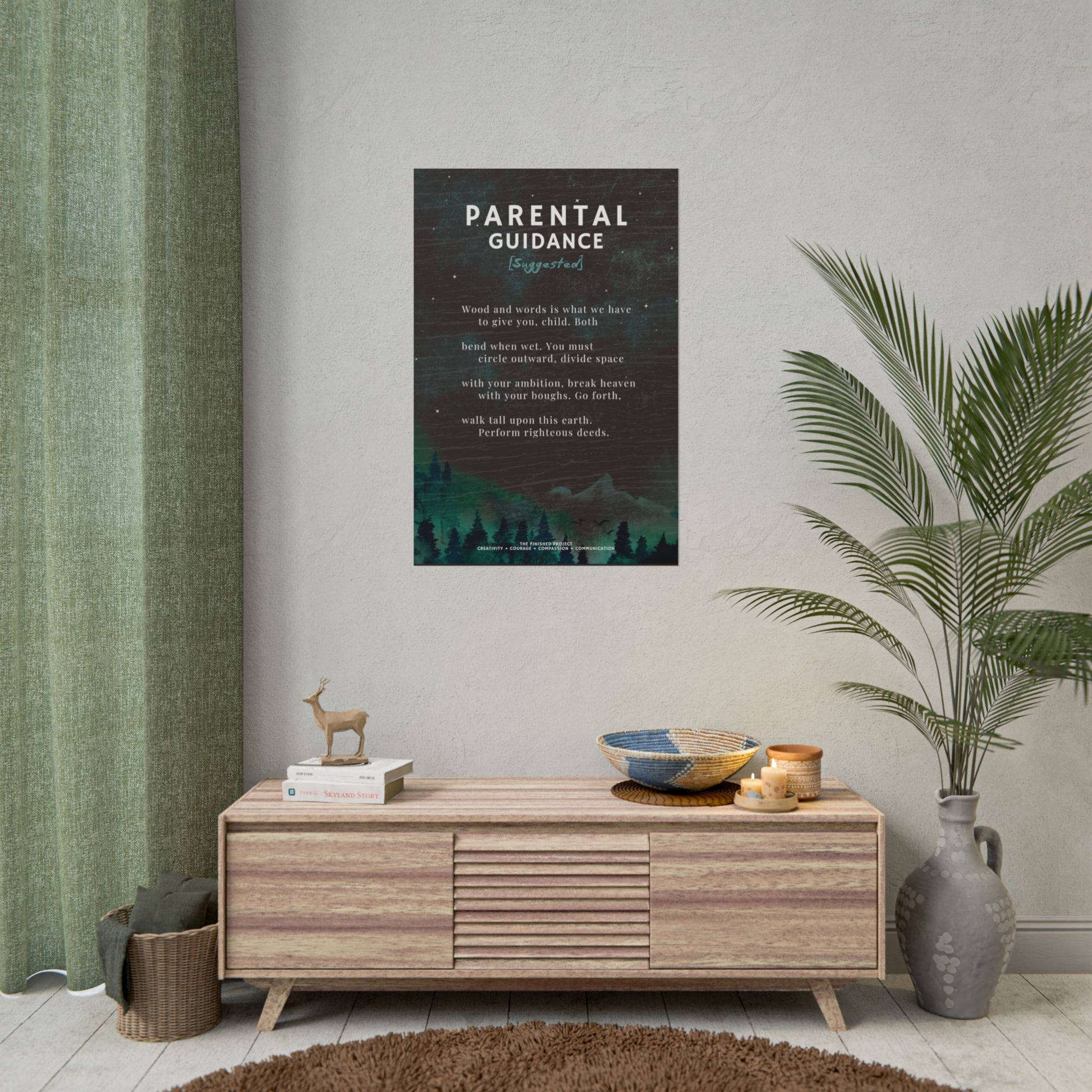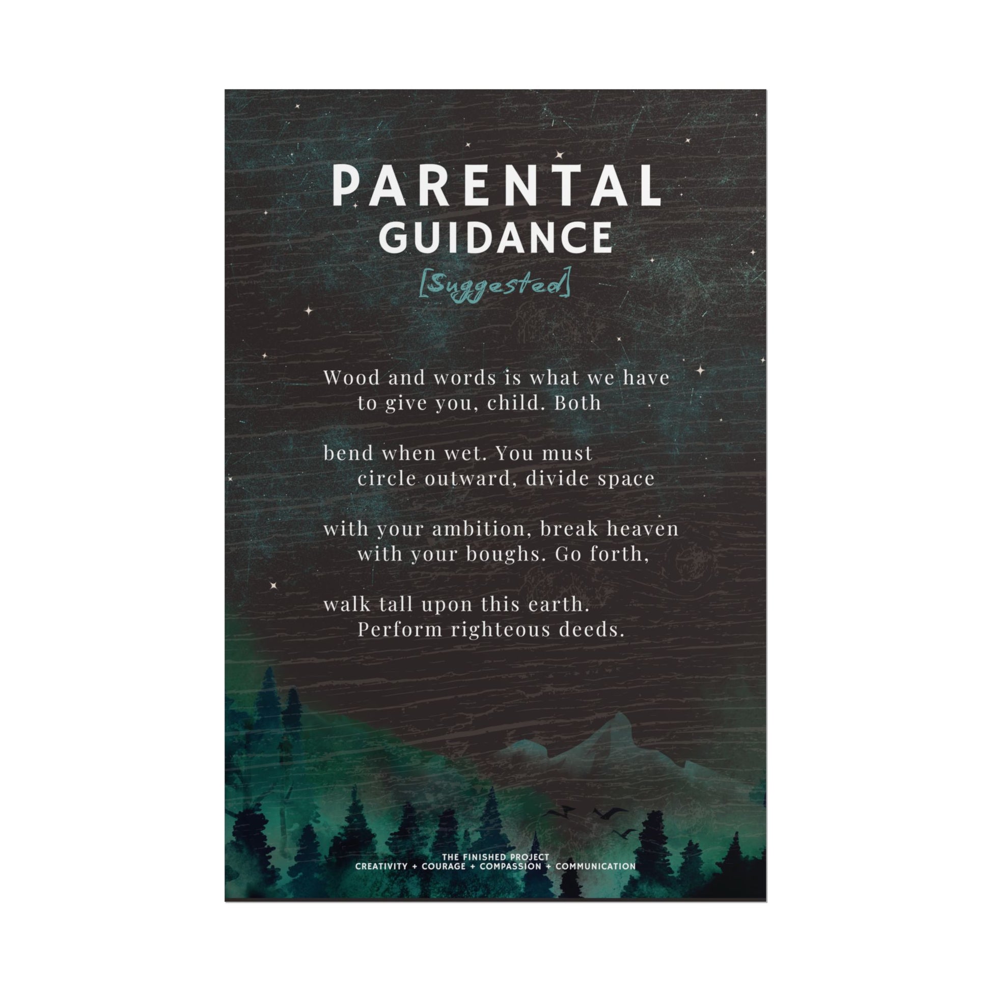 Put a poetic spin on parental advice with the "Parental Guidance [Suggested]" poetry + art poster from The Finished Project. This unframed poetry print is made with museum-grade, heavyweight art paper and comes in two sizes to fit your living space.